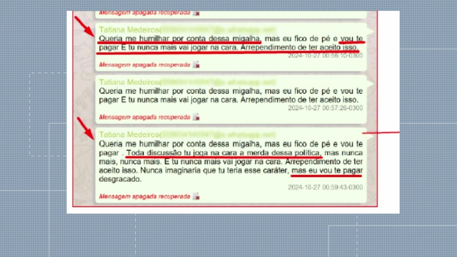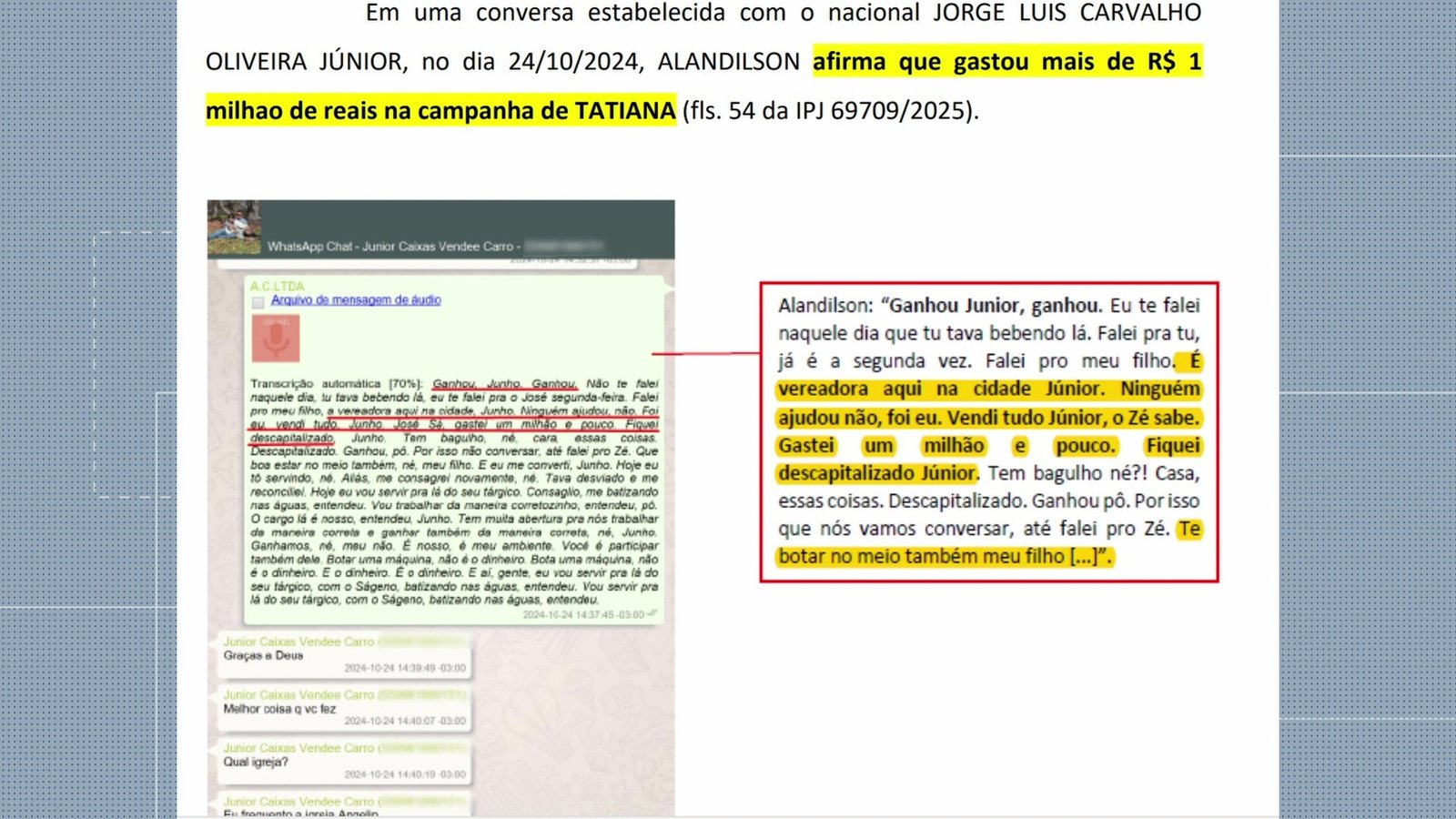 O inquérito inclui prints de conversas entre Tatiana e Alandilson, que apontam um suposto esquema de compra de votos durante as eleições de 2024. Em um dos registros, é possível ver uma troca de mensagens onde o namorado cobra o valor gasto na campanha. A vereadora responde afirmando que irá quitar a dívida, inclusive mencionando que venderia o carro para efetuar o pagamento.