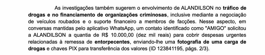 Em um trecho do documento, é citado um contato identificado como “Amigo”, que solicitou a Alandilson a quantia de R$10.000,00 para cobrir despesas urgentes relacionadas a uma carga de entorpecentes, enviando uma fotografia da carga de drogas e chaves Pix para a transferência dos valores.