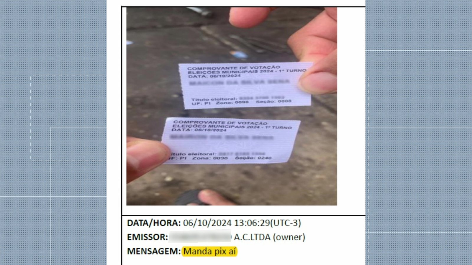 O inquérito também apresenta comprovantes de votação e mensagens de eleitores cobrando o pagamento via Pix, com Alandilson afirmando que gastou mais de um milhão de reais para eleger a vereadora.