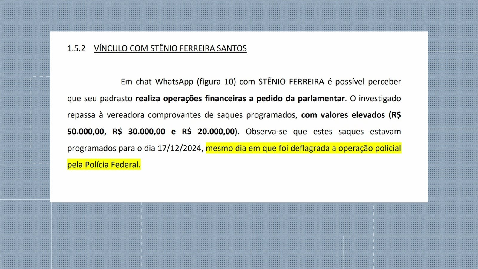 A investigação também revela o envolvimento de Stênio Ferreira dos Santos, padrasto de Tatiana Medeiros. O documento expõe que Stênio realizava operações financeiras a pedido da parlamentar, incluindo o repasse de comprovantes de saques programados de valores elevados, chegando a R$50.000,00. O inquérito contém uma lista detalhada de operações financeiras encaminhadas para Alandilson.