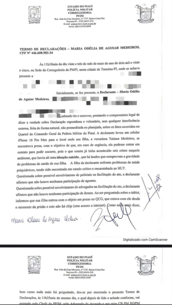 A empresária Maria Odélia de Aguiar Medeiros, mãe da vereadora Tatiana Medeiros, confessou em depoimento prestado à Corregedoria da Polícia Militar que foi ela quem levou o telefone celular iPhone para a sala onde a filha se encontrava presa no Quartel do Comando Geral (QCG) da Polícia Militar.