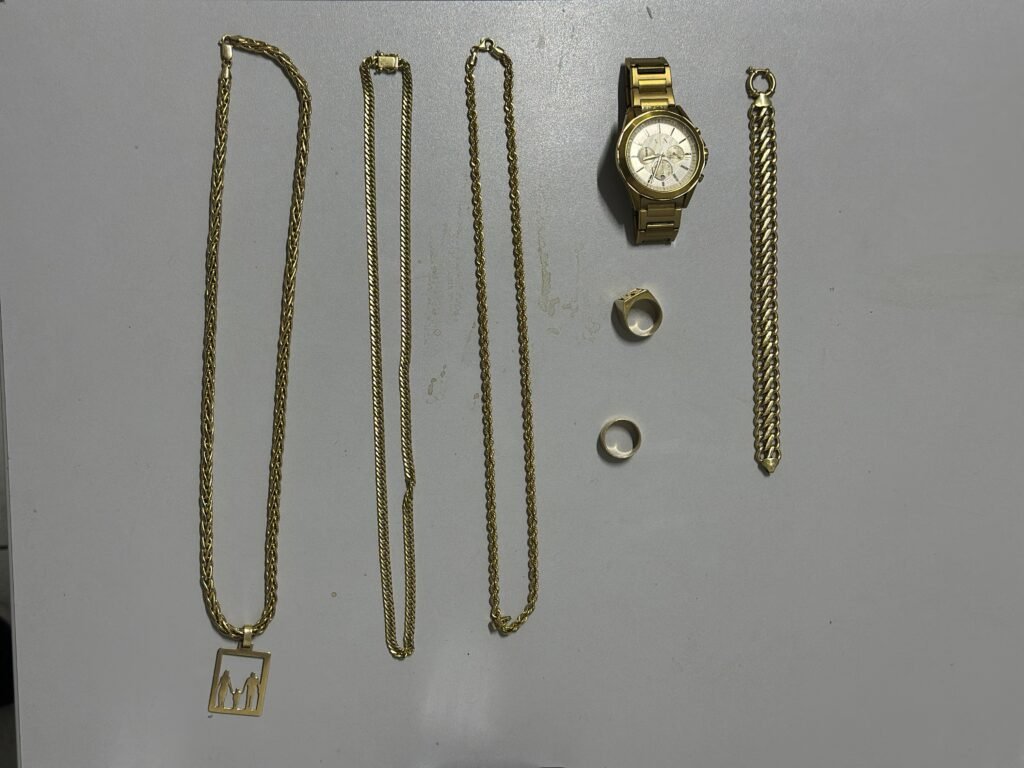 As joias foram apreendidas durante uma operação policial na Vila Mandacaru, zona Leste de Teresina. Ao todo, sete peças de ouro foram encontradas pela Superintendência de Operações Integradas (SOI).