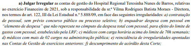 De acordo com o TCE, foram constatadas diversas irregularidades, incluindo contratações de pessoal sem concurso público ou processo seletivo, enquadramento indevido de despesas com pessoal com o objetivo de burlar o cálculo do limite legal da Lei de Responsabilidade Fiscal (LRF), além de médicos com carga horária acima de 70 horas semanais e com acúmulo de cargos na administração pública, contrariando a Constituição Federal e normas estaduais.