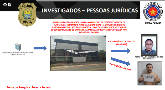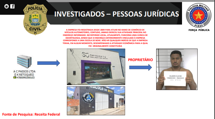 Uma das empresas investigadas tem como proprietário Alandilson Passos, apontado como líder da organização criminosa. No local atualmente funciona uma clínica de odontologia, mas anteriormente abrigava uma escola de boxe. A empresa foi registrada para atuar no ramo de comércio de veículos automotores, embora nunca tenha exercido essa atividade de fato.