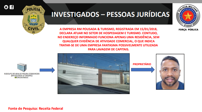 Em outro caso envolvendo empresa usada para lavagem de dinheiro, um dos principais investigados, Deivison José, registrou uma farmácia como nome fantasia. No entanto, no endereço informado funciona uma farmácia com nome diferente, pertencente a outra pessoa, sem qualquer vínculo com a empresa registrada por ele.