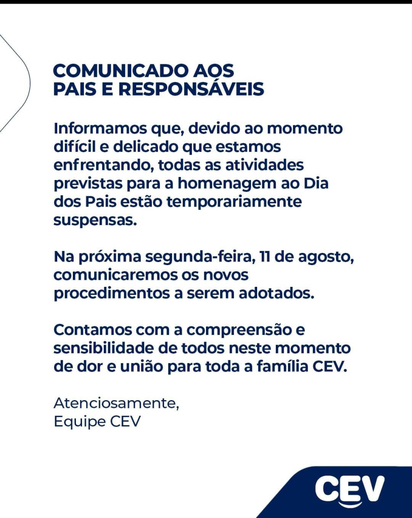 O Colégio CEV suspendeu as aulas em todas as unidades após a morte da criança. As comemorações do Dia dos Pais, que estavam previstas para esta semana, também foram canceladas temporariamente. A expectativa é de que as atividades sejam retomadas na próxima segunda-feira (11).