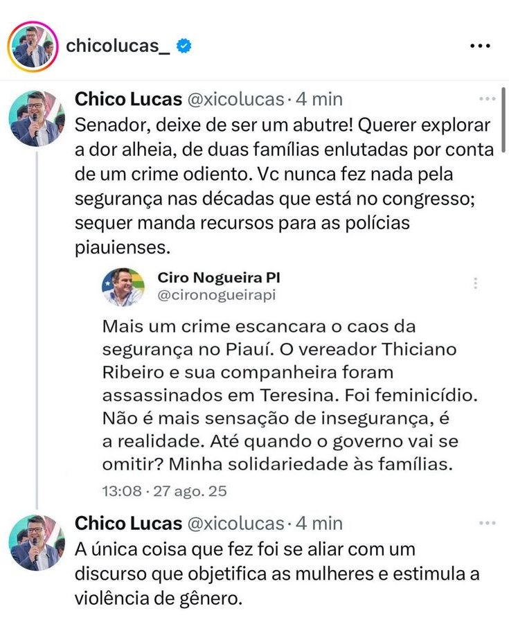 O secretário também criticou a atuação do parlamentar no Congresso e afirmou que Ciro não destina recursos para as forças policiais do Piauí. A troca de farpas continuou com uma nova publicação de Chico, na qual ele acusa o senador de propagar um discurso de ódio que estimula a violência de gênero.