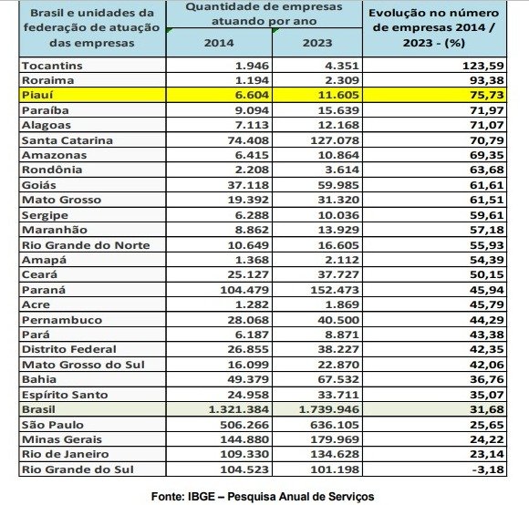 O Piauí é o terceiro estado brasileiro com mais empresas de serviços não financeiros, apontou o levantamento do Instituto Brasileiro de Geografia e Estatística (IBGE) divulgado nesta quarta-feira (27). Os dados são referentes ao período de 2014 a 2023 e mostram que houve aumento de 75,73% no número de registros.