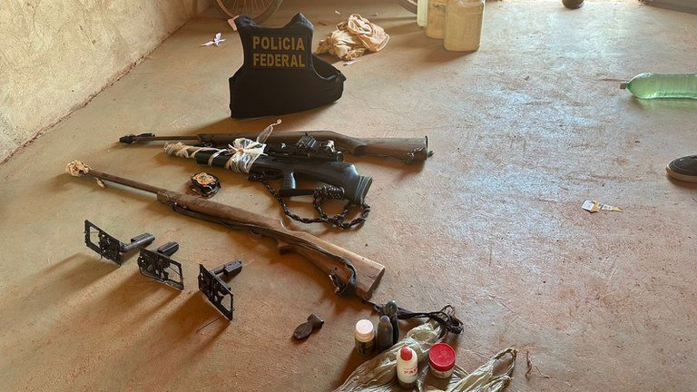 Três pistolas, uma carabina, carregadores, coldres, alongadores, kits de limpeza, maletas e diversos acessórios de armamento foram encontrados