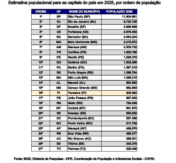 Estimativa populacional para as capitais do país, em 2025 (Foto: IBGE)