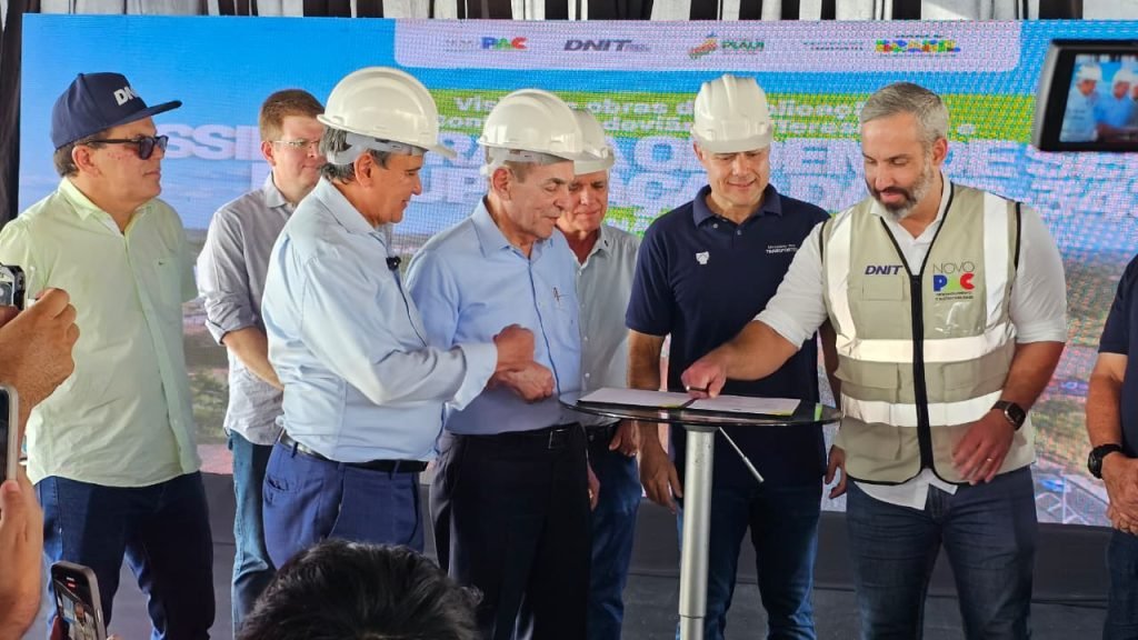 O ministro dos Transportes, Renan Filho, assinou na tarde desta sexta-feira (5), em Teresina-PI, a ordem de serviço para a duplicação e restauração da BR-343, entre a capital e Altos-PI. A solenidade contou com a presença do ministro do Desenvolvimento e Assistência Social, Família e Combate à Fome, Wellington Dias, e do senador Marcelo Castro (PT).