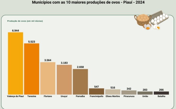 O município de Valença do Piauí é considerado, no período, avaliado, o maior produtor de ovos do estado em 2024, com cerca de 6,9 milhões de dúzias de ovos, representando 21,3% do total produzido no Piauí.