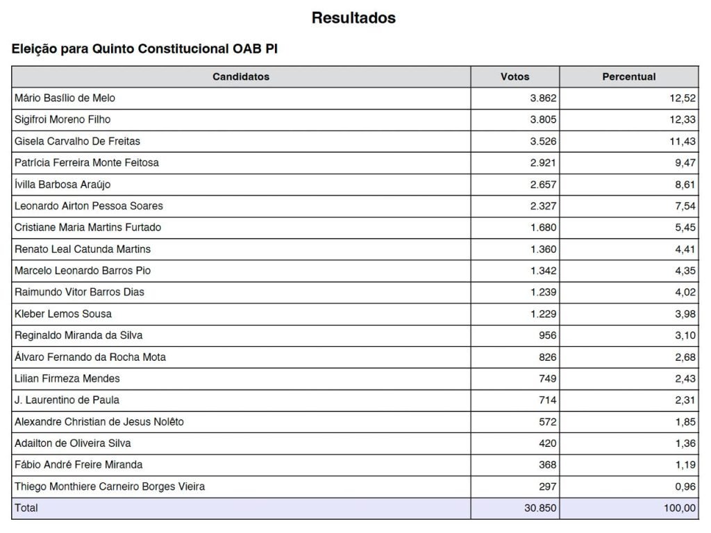 A Ordem dos Advogados do Brasil – Seccional Piauí (OAB-PI) realizou nesta segunda-feira (22) a votação on-line do Quinto Constitucional, que definiu 12 nomes mais votados pela classe para a vaga de desembargador do Tribunal de Justiça do Piauí (TJ-PI).