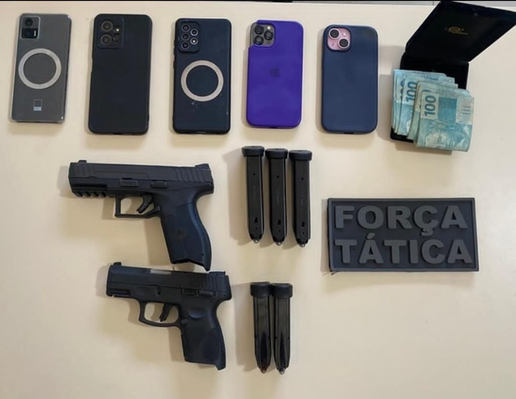 Durante a revista, os agentes encontraram duas pistolas calibre 9 mm, uma com a numeração raspada, além de várias munições e dinheiro em espécie. Os suspeitos foram levados para a Delegacia de Polícia Civil da cidade.
