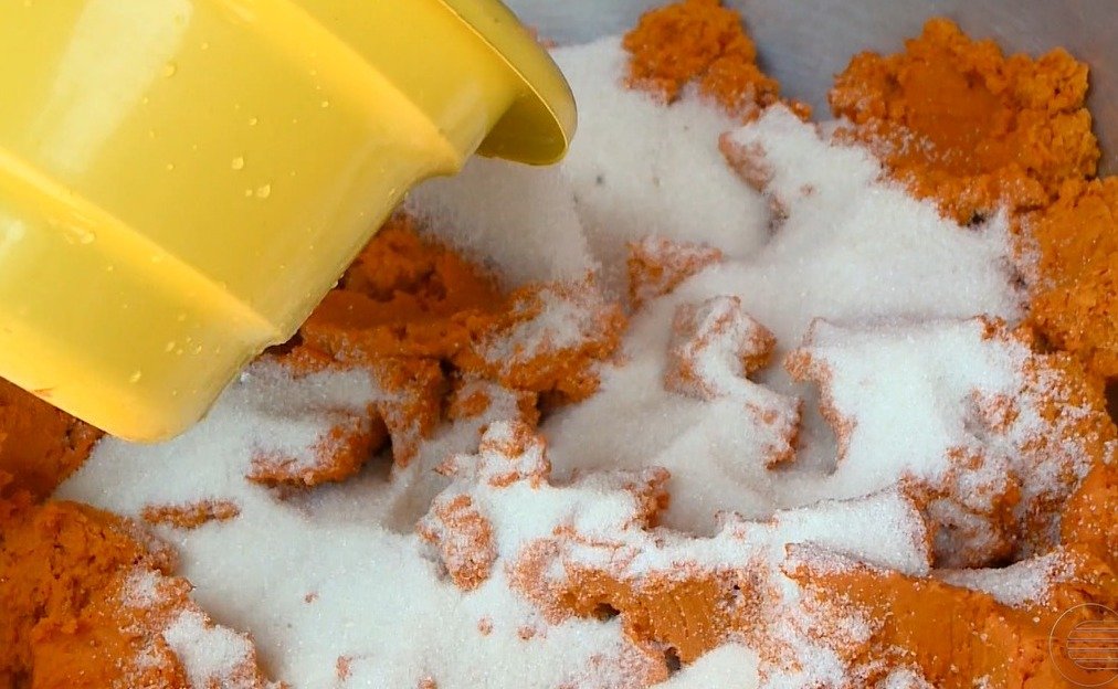 A etapa seguinte da receita envolve a mistura da polpa com quantidade de açúcar proporcional na panela. Para mexer os ingredientes, o produtor rural utiliza um talo de buriti e muita força no braço.