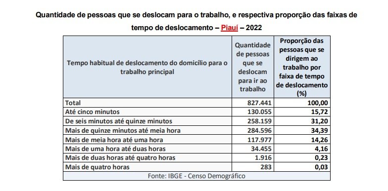 A maior parcela dos piauienses, equivalente a 34,39%, leva entre 15 e 30 minutos no trajeto, enquanto 31,2% gastam de seis a quinze minutos. Já 15,72% chegam ao trabalho em até cinco minutos. Em contrapartida, cerca de 2,2 mil pessoas, que representa 0,26% do total de ocupados no estado, enfrentam deslocamentos superiores a duas horas.