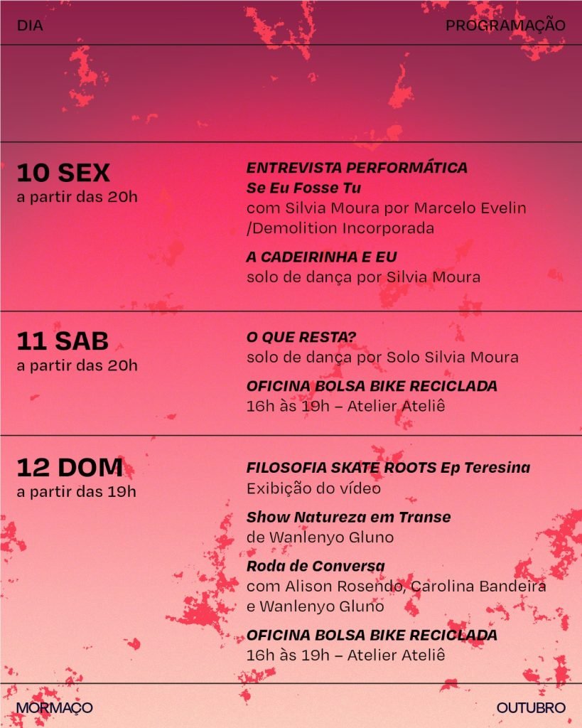 O projeto Mormaço de Outubro inicia as atividades do mês no CAMPO Arte Contemporânea, em Teresina, com dois dias dedicados à dança e à performance. As apresentações acontecem nesta sexta-feira (10) e sábado (11), com a presença da artista Silvia Moura, referência da dança contemporânea cearense, e do coreógrafo Marcelo Evelin.