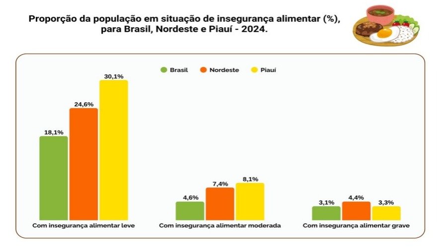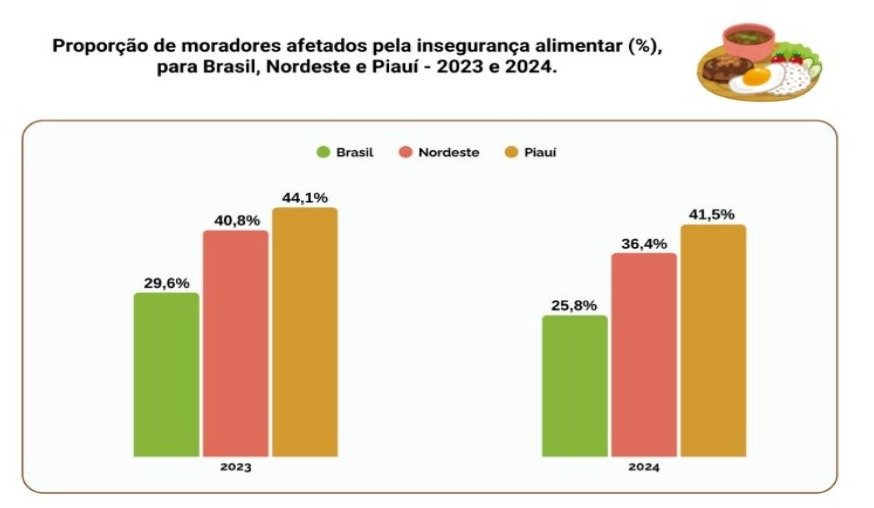 De acordo com o IBGE, cerca de 53 mil piauienses saíram da situação de insegurança alimentar grave. Apesar disso, 112 mil pessoas no estado ainda são acometidas pelo problema. No quadro geral, 30,1% da população do estado vivia em situação de insegurança alimentar leve (1,01 milhão de moradores de domicílios), 8,1% moderado (274 mil pessoas) e 3,3% grave (112 mil indivíduos).