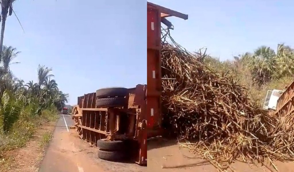 Vídeo: motorista perde o controle e carreta carregada de cana-de-açúcar tomba na PI-112