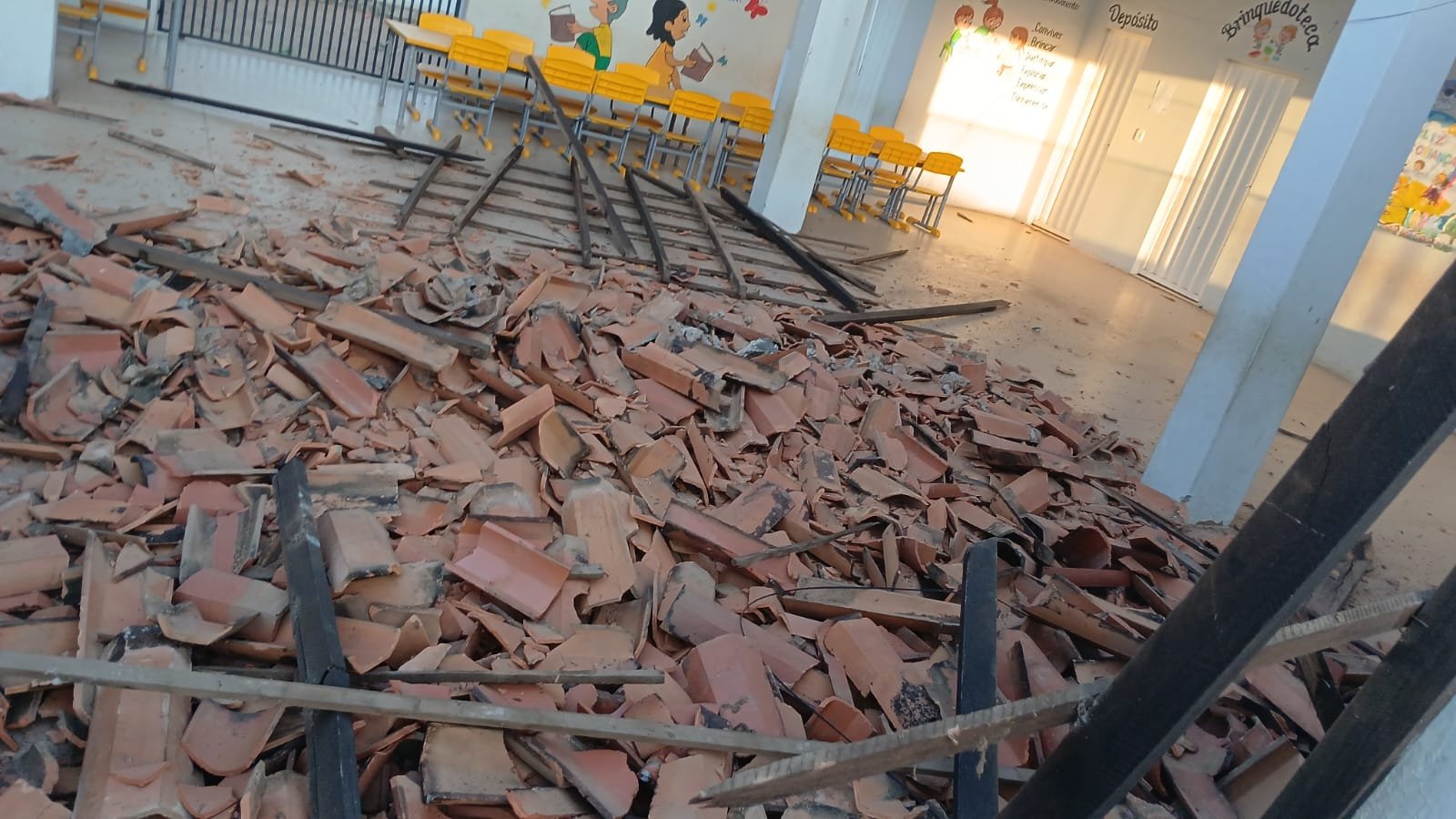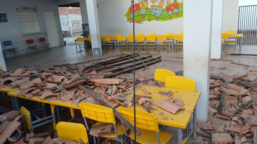Parte do teto do pátio de uma creche, localizada no bairro Codó, em Dom Expedito Lopes (PI), desabou na tarde de segunda-feira (27). A unidade de ensino atende mais de 100 crianças da rede municipal.