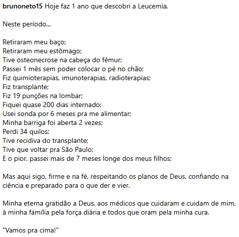 Em sua postagem, Bruno relatou que, no tratamento contra o câncer, precisou retirar o baço e o estômago, e sofreu uma necrose na cabeça do fêmur. Ele passou um mês sem poder pisar no chão e seis meses utilizando sonda para se alimentar.