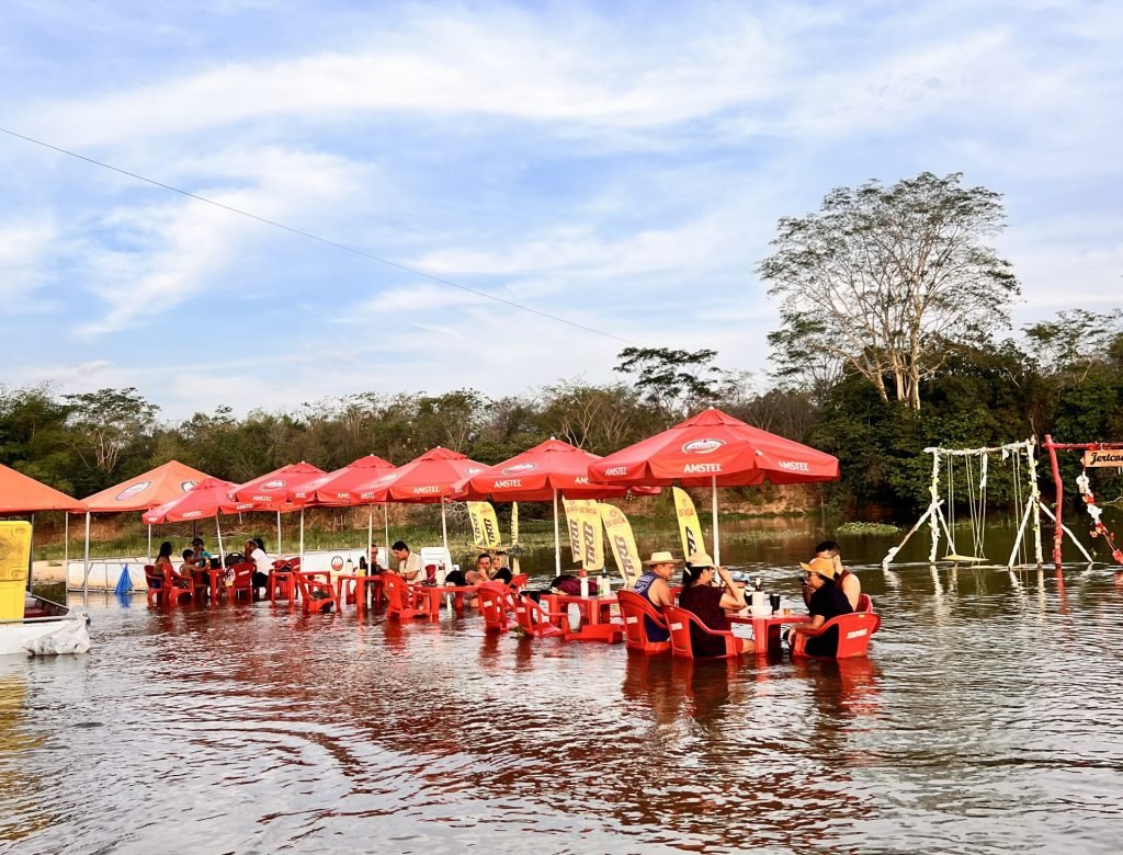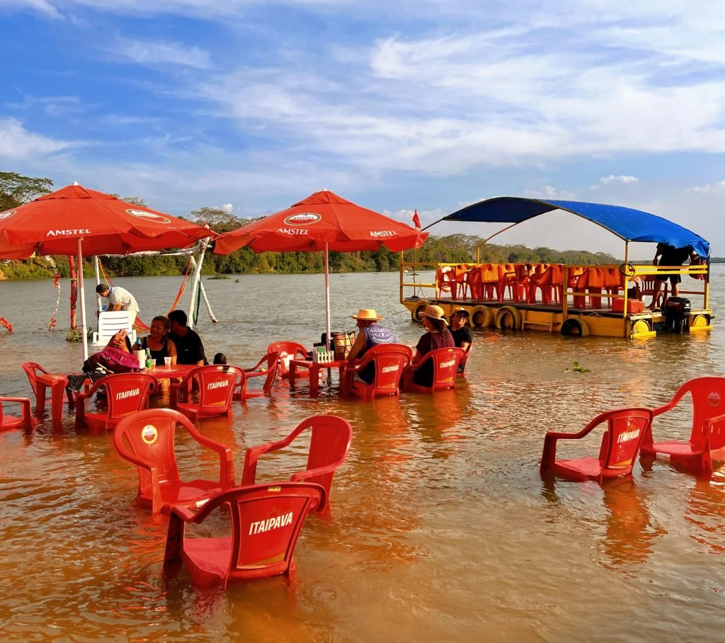 A experiência já começa no percurso. Para chegar até o bar, é preciso atravessar o rio em uma balsa e apreciar a paisagem da natureza. O trajeto, simples e tranquilo, dura cerca de cinco minutos e custa R$ 10. Na chegada, o cenário chama a atenção: cadeiras e mesas dentro da água, onde os visitantes se instalam para comer, beber e conversar, tudo isso enquanto se refrescam no rio.