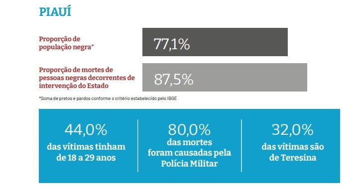 Apesar de a letalidade policial no Piauí apresentar uma redução no número absoluto de casos, os dados do estudo destacam que a seletividade racial é uma marca na estrutura da violência policial. Como resultado, pessoas negras têm muito mais chances de serem mortas.