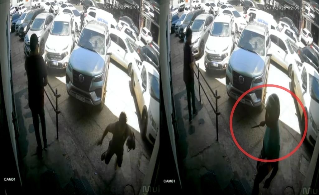 A filmagem mostra o momento em que a vítima entra no local sendo perseguida por um indivíduo que porta uma faca.
