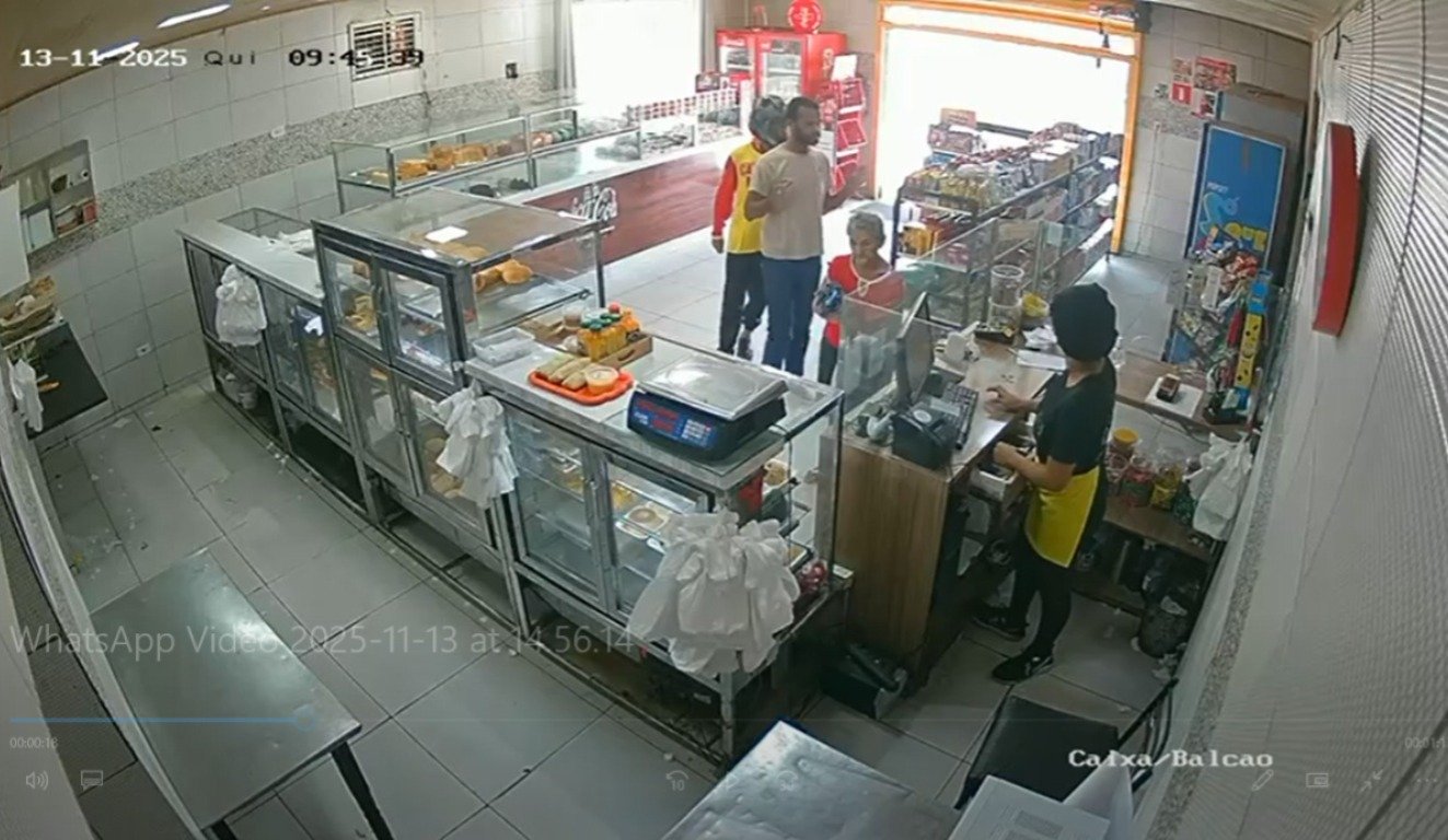 Dois criminosos renderam funcionários e clientes durante assalto a uma padaria na manhã desta quinta-feira (13), no bairro Lourival Parente, zona Sul de Teresina. Uma câmera de segurança registrou a ação e mostra o momento em que a dupla armada, usando capacete, invade o estabelecimento, anunciando o roubo.