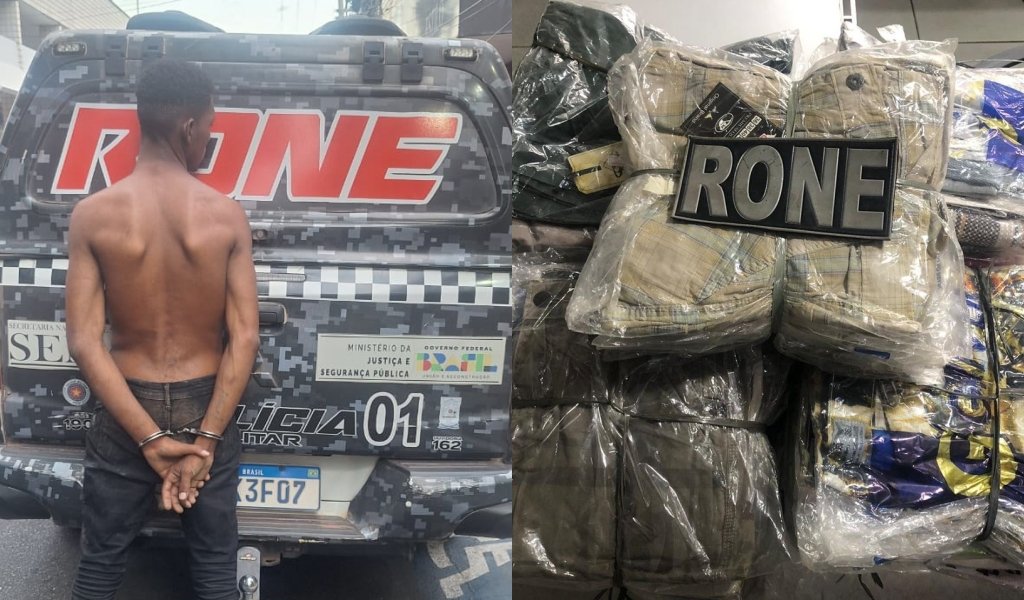 Com o suspeito, policiais do Batalhão de Polícia de Rondas Ostensivas de Natureza Especial (BPRONE) encontraram 85 bermudas que teriam sido levadas do estabelecimento.