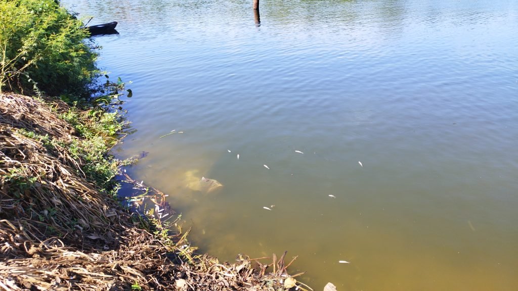 A foto registrada na Rua Beira Rio mostra peixes mortos boiando, lixo e uma camada de aguapés sobre a água. Pescadores e ribeirinhos denunciam que os aguapés já ocupam cerca de 2 km do rio, prejudicando quem vive da pesca.