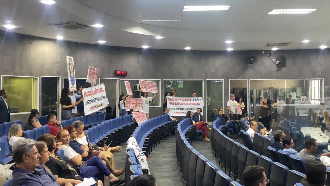 Professores da rede pública municipal de Teresina protestaram pelo segundo dia seguido, na Câmara Municipal, na manhã desta quarta-feira (3). Os servidores são contra o projeto de lei da Prefeitura de Teresina, que modifica o processo de escolha dos diretores e diretores-adjuntos das unidades escolares.