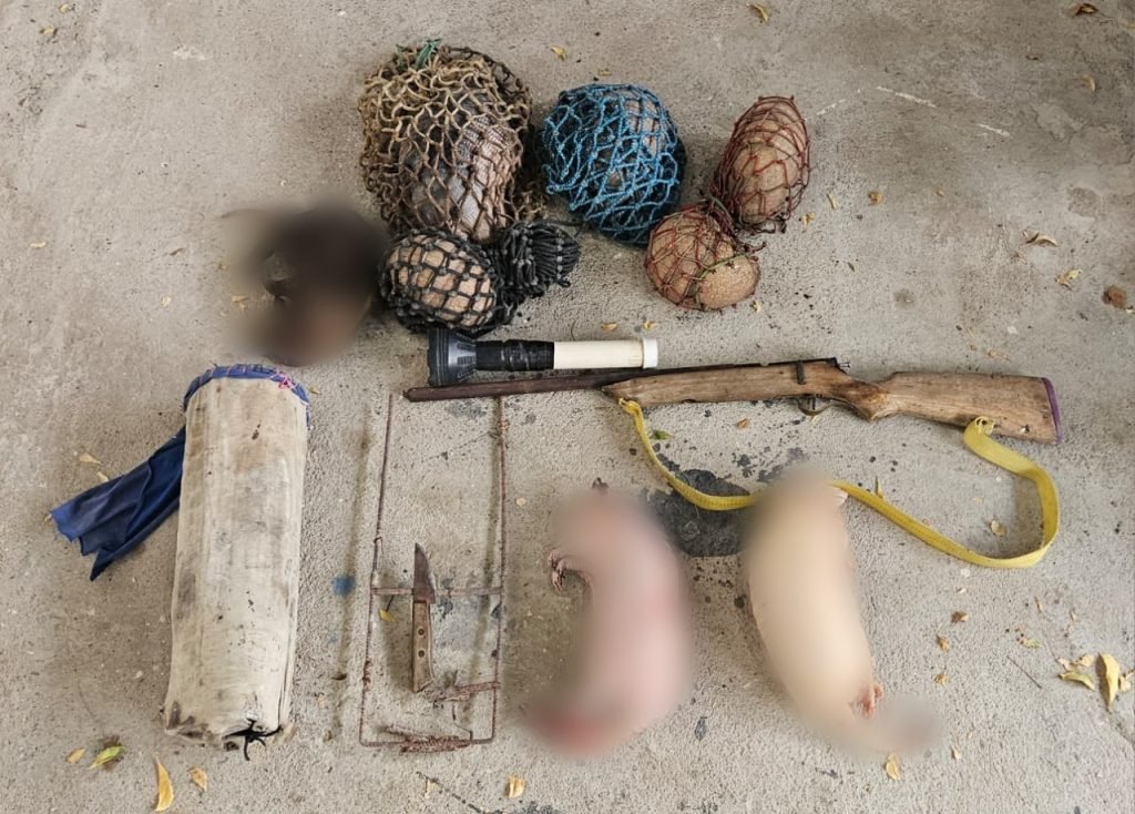 No local foram encontrados cinco tatus vivos presos em redes, uma ave silvestre da espécia ‘azulão’ mantida em cativeiro, além de dois tatus e um gabá mortos. Foram apreendidos também munições, pólvora, uma espingarda, uma moto e materiais para captura de animais.