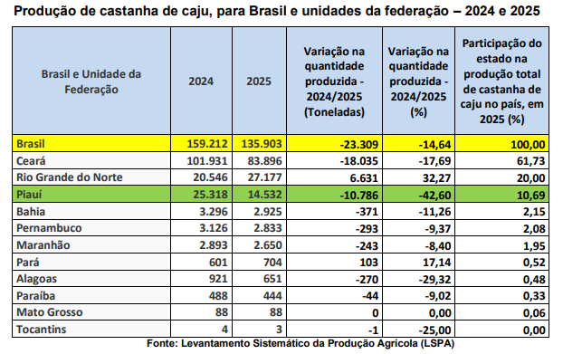 Ao nível nacional, o Brasil produziu 135,9 mil toneladas de castanha de caju em 2025, uma redução de 14,64% em comparação com o ano anterior.
