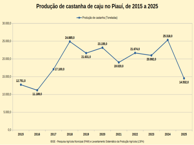 Na série histórica, a produção de castanha de caju no estado já chegou a 56,2 mil toneladas em 2008. O volume registrado em 2025 representa uma queda de cerca de 74% em relação a esse pico.