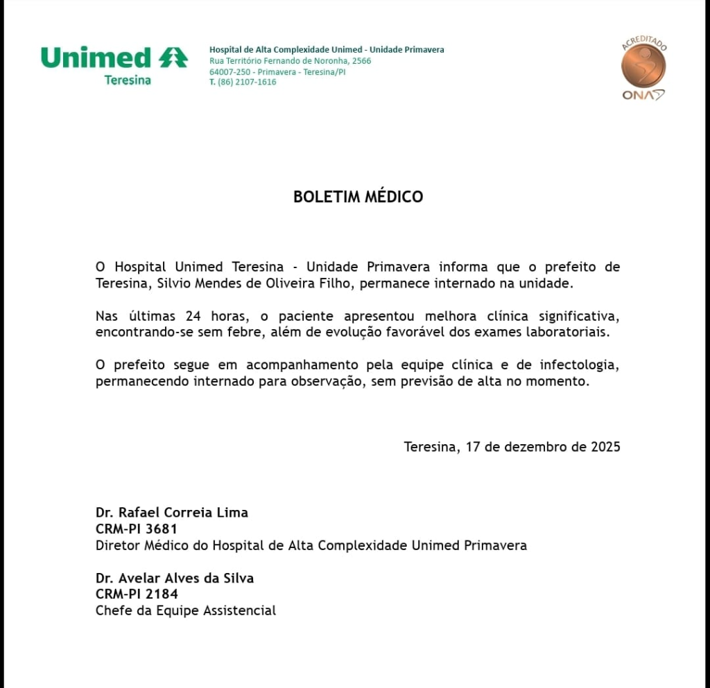 O estado de saúde do prefeito Silvio Mendes (União Brasil) apresentou evolução positiva, conforme o novo boletim médico divulgado nesta quarta-feira (17). Apesar da melhora clínica, o gestor permanece internado no Hospital da Unimed, em Teresina, para continuidade do tratamento.