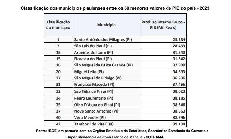 O Piauí é o segundo estado que mais tem municípios na lista dos 50 menores valores do PIB do Brasil, com 14 cidades. Ficando atrás somente da Paraíba, que tem 21 municípios. O terceiro lugar fica com Minas Gerais, com 10.