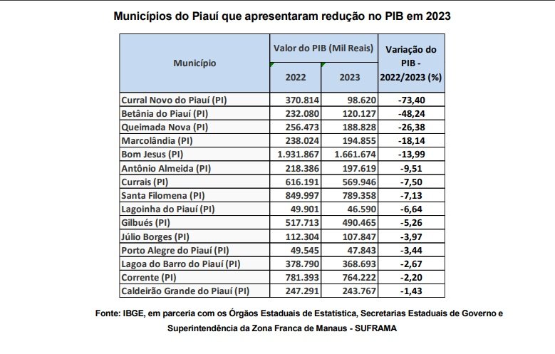 Outros municípios piauienses que também registraram queda no PIB foram Betânia do Piauí, com diminuição de 48,24% e Queimada Nova que caiu 26,38%.