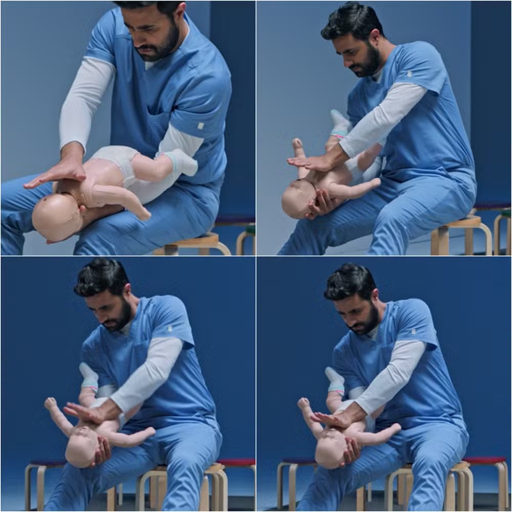 - Repetição: Alterne os movimentos até o objeto ser expelido. Se o bebê desmaiar, inicie a reanimação (RCP) e ligue para o 192.