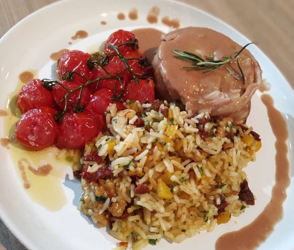 E se o protagonista é encantador, os acompanhamentos elevam ainda mais a experiência. O arroz festa é preparado na manteiga e enriquecido com castanhas, amêndoas e uvas passas, trazendo textura, cor e aquele sabor clássico das ceias brasileiras. Para completar, mini tomates assados, que estouram na boca como pequenas joias, trazendo acidez e frescor ao prato.