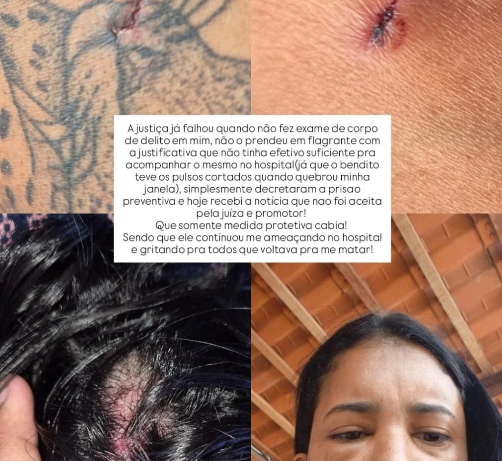 “Tenho todos os prints (registros de tela) dizendo que não queria ele; por isso, invadiu minha casa, me espancou e ameaçou voltar para me matar. Fiz a denúncia e, com isso, aconteceram várias falhas aconteceram na polícia. E hoje recebi a triste notícia de que o responsável não vai receber voz de prisão, somente a medida protetiva. Injustiça!”, desabafou nas redes sociais.
