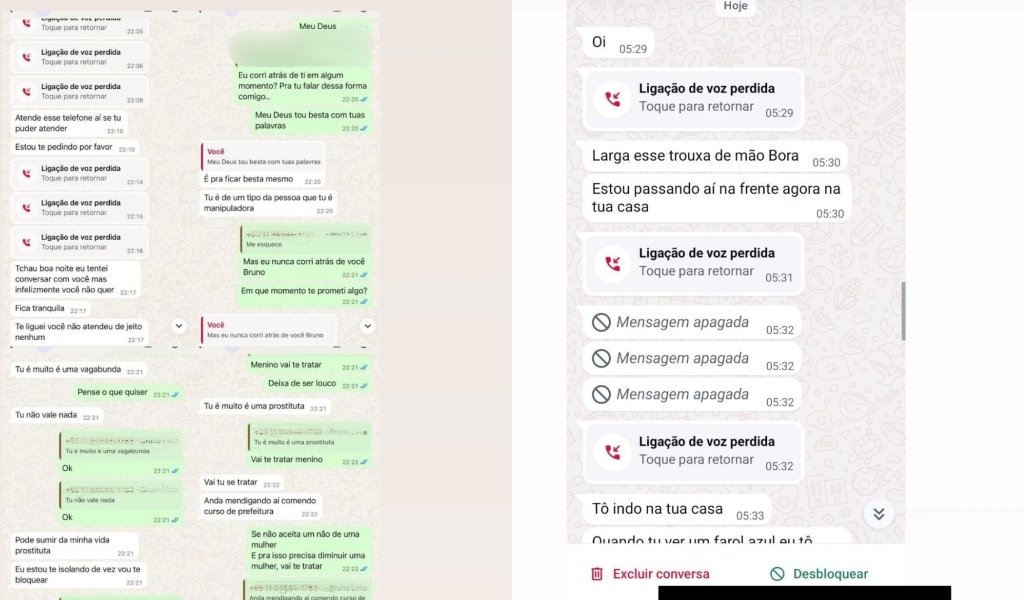 “Ele foi bloqueado em setembro, mas troquei de celular em dezembro e os contatos foram desbloqueados. Ele começou a mandar mensagens e o meu namorado mandou áudio para ele no dia 31 (de dezembro) pedindo para parar, e aí foi aí que ele [suspeito] se alterou. Me chamou de prostituta e disse que eu iria aprender a respeitar ele”, disse a secretária.
