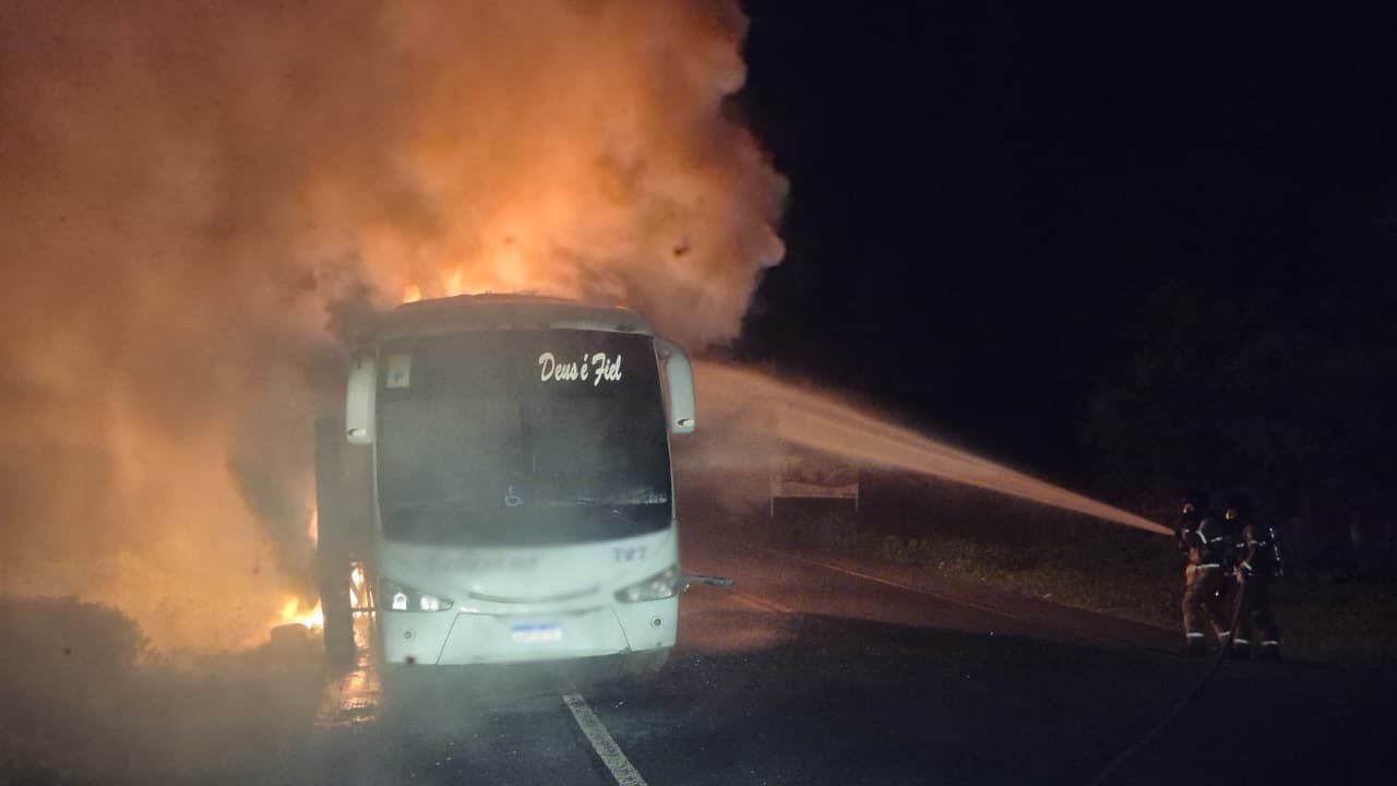 Um ônibus de turismo pegou fogo na BR-343 em Floriano (PI) por volta das 22h40 no domingo (4). O veículo estava apenas com o motorista, que não ficou ferido.