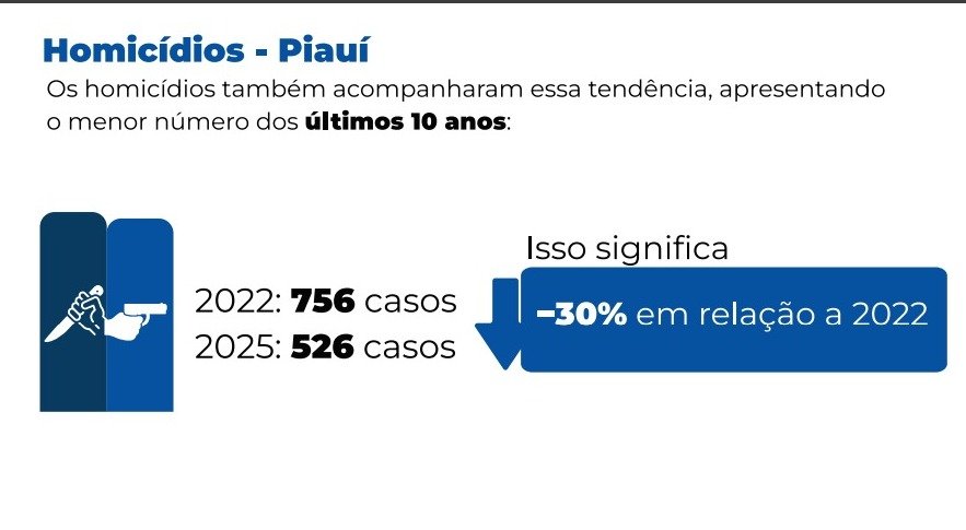 Foram registrados 526 casos de homicídios no Piauí em 2025, uma queda de 30% em relação a 2022, quando se teve 756 ocorrências.