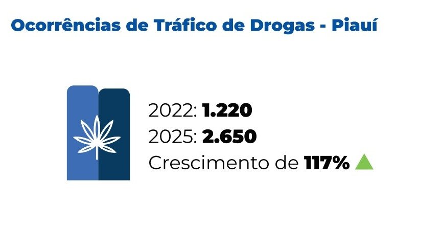 Em contrapartida, o número de ocorrências de tráfico de drogas no Piauí em 2025 cresceu 117% em relação a 2022. No ano passado, 2.650 casos foram registrados. Em 2022, foram 1.220.