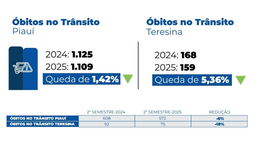 O Piauí registrou uma leve caída no índice de mortes no trânsito em 2025, cerca de 1,42% em relação ao ano de 2024. Um total de 1.109 óbitos foram registrados, 26 menos do que no ano antecedente. Somente em Teresina, 159 óbitos no trânsito foram registrados, uma queda de 5,36% em relação a 2024.