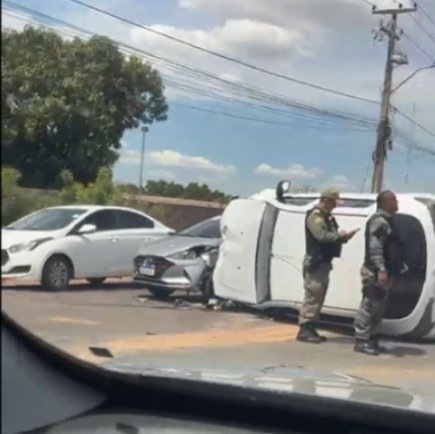 Uma colisão entre dois veículos de passeio deixou um dos automóveis capotado na tarde desta sexta-feira (9), na BR-343, na altura do bairro Dirceu, zona Sudeste de Teresina. Imagens registradas por motoristas que passavam pelo local mostram o veículo com as rodas para cima, ocupando parte da pista.