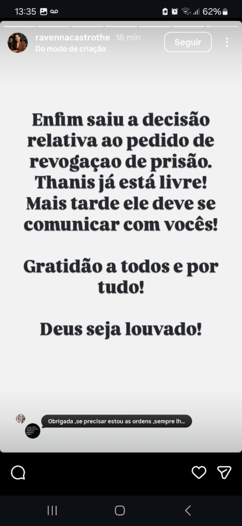 Em publicação no Instagram, a advogada informou que o influenciador deve se manifestar publicamente em breve. “Enfim saiu a decisão relativa ao pedido de revogação de prisão. Thanis já está livre. Mais tarde ele deve se comunicar com vocês! Gratidão a todos e por tudo! Deus seja louvado!”, escreveu a jurista.