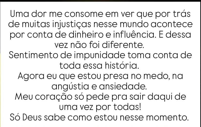Em seu desabafo, Mery expressou frustração com a decisão judicial: “O sentimento de impunidade toma conta de toda essa história. Só Deus sabe como estou nesse momento”, escreveu.