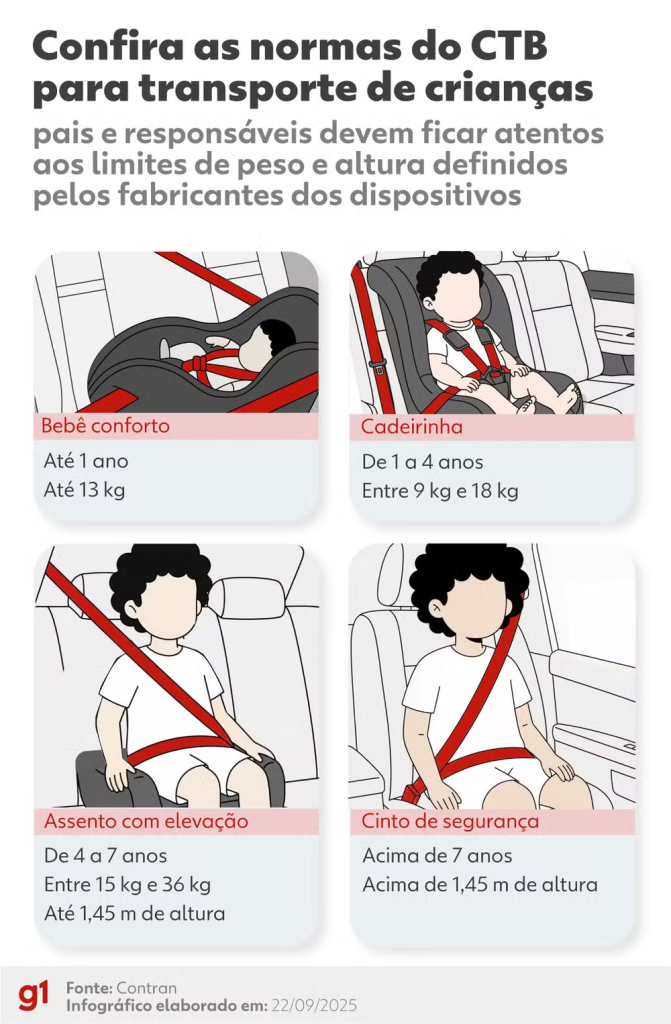 De acordo com o CTB (art. 64 e art. 168) e a Resolução nº 819/2021 do Conselho Nacional de Trânsito (Contran), crianças com idade inferior a 10 anos que não tenham atingido 1,45 metro de altura devem ser transportadas no banco traseiro do veículo, utilizando o dispositivo de retenção adequado à sua idade, peso e estatura.